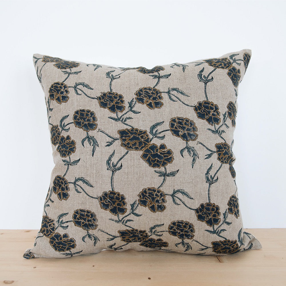Beautifully hand block-printed pillows on linen fabric. Featuring floral pattern printed with exquisite detailing. Heavy cotton backing.