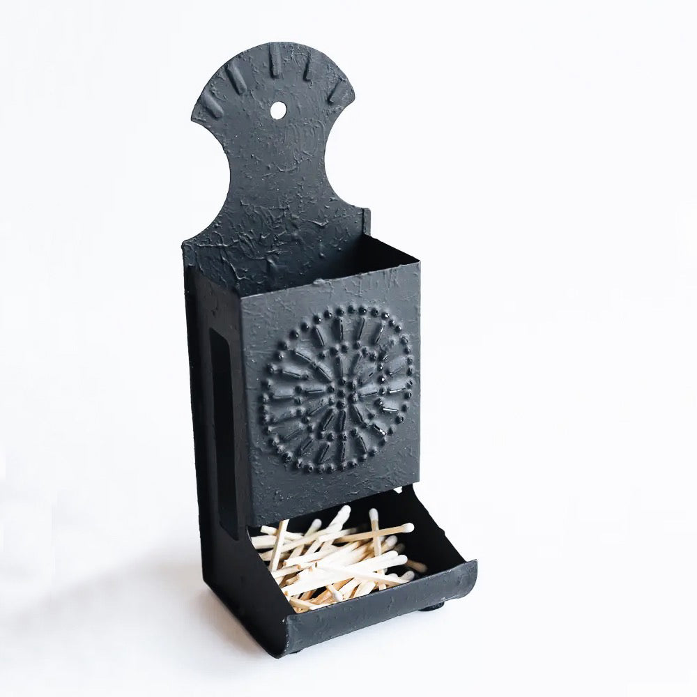A lightweight tin matchstick holder combining practicality and functionality in matchstick storage.  Designed to accommodate a large matchbox within its confines, it features a strategically placed strike zone opening on the side, ensuring ease of use and quick access.
