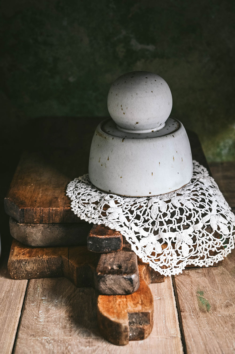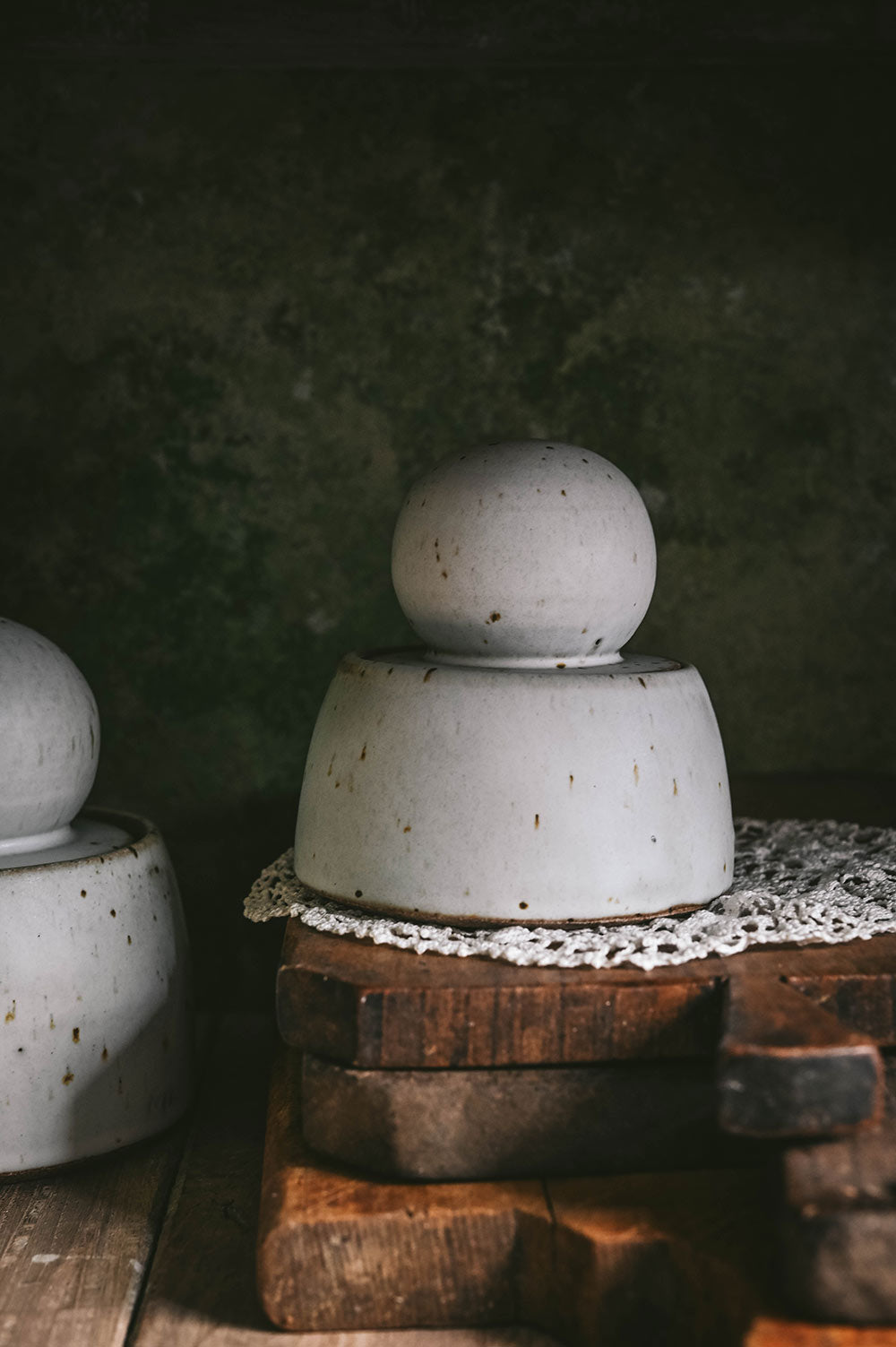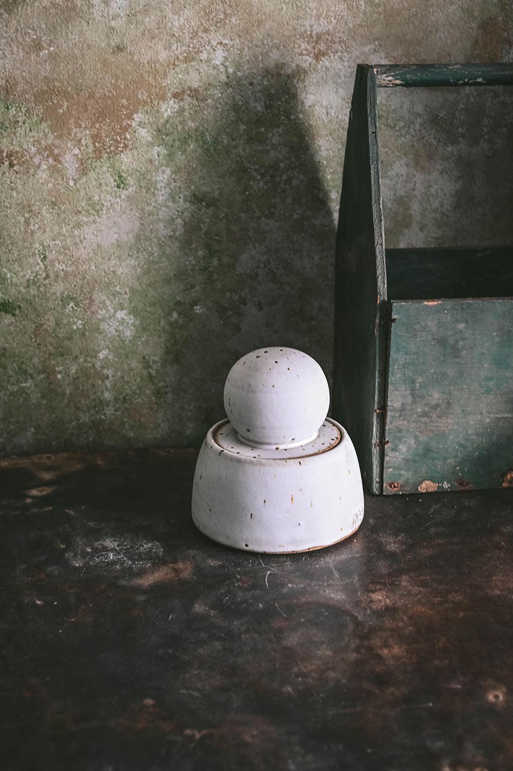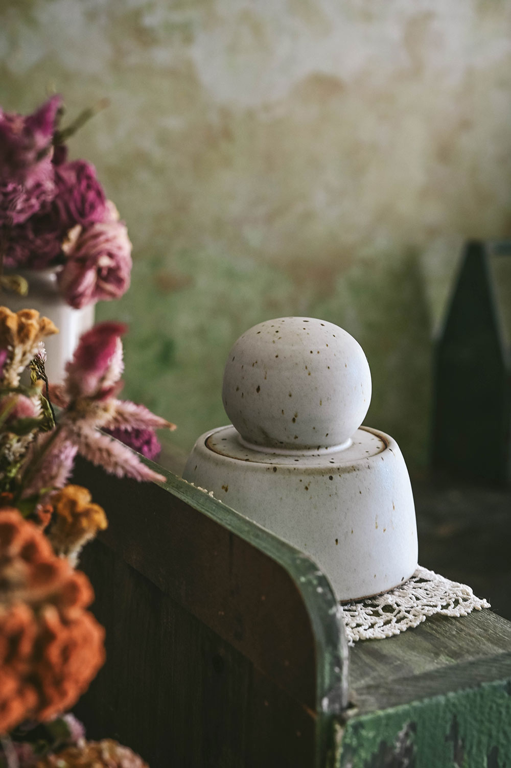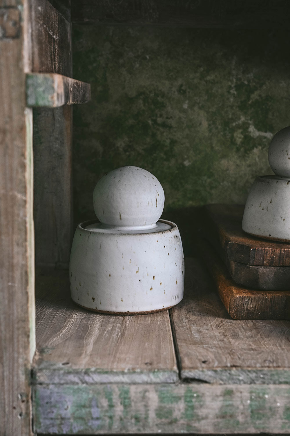 Hand-thrown from stoneware and finished with a soft matte glaze, these jars are accented with generous, sculptural knobs. The smaller sizes keep spices, salts, and bath essentials close at hand, while the larger jars offer striking storage for pantry items, utensils, or styled objects in any room.