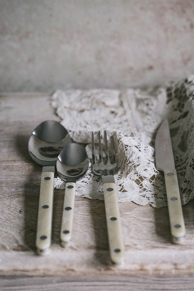 Stunning bistro flatware set includes a soup spoon, dinner fork, dinner knife, and teaspoon. It is a perfect blend of vintage elegance and modern craftsmanship.